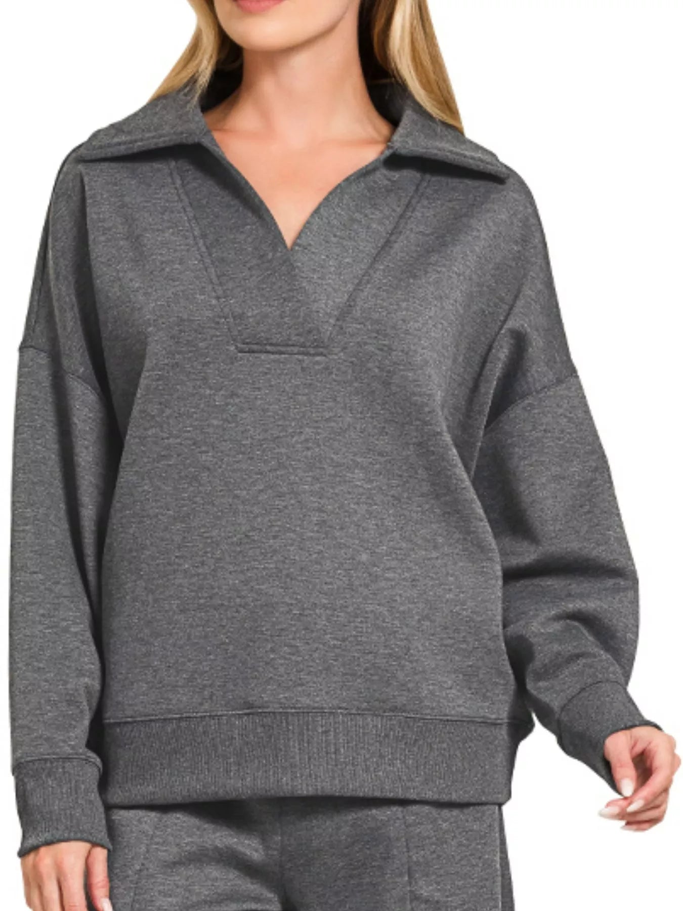 Step up your loungewear game with this sleek scuba collared pullover and pants set. The scuba material offers a modern and stylish look, while the collared design adds a touch of refinement. Perfect for relaxing at home or running errands in comfort and style. Elevate your casual wear with this coordinating set. A must-have addition to your leisure wardrobe.