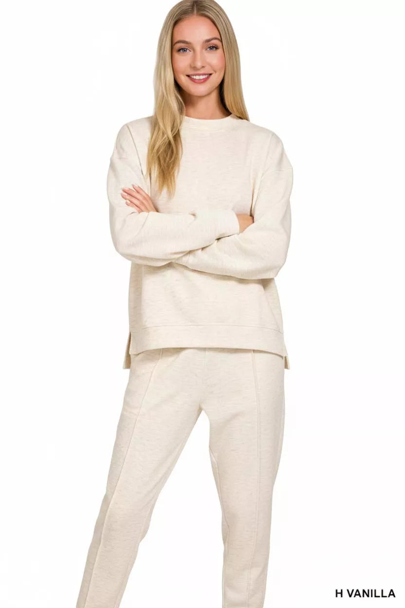 This Zenana Scuba Mock Neck Sweatshirt and Joggers Set offers ultimate comfort and style. Made from soft scuba knit fabric, this set is perfect for lounging at home or running errands. The sweatshirt features a mock neck design, while the joggers have an elastic waistband and side pockets for added convenience. The relaxed fit ensures all-day comfort. Available in a range of colors, this set is a versatile addition to any wardrobe. Material: Scuba Knit. Selling points: Comfort, style, versatility.